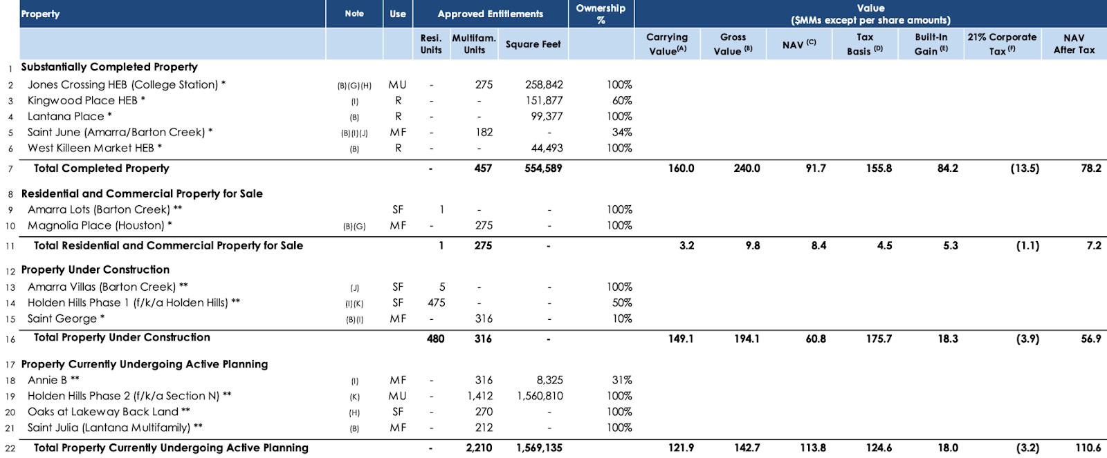 Rounding out the rest is Jones Crossing, an H-E-B-anchored mixed-use project in College Station with 154,092 square feet of fully leased retail space and 104,750 square feet of commercial development potential, and Saint June, a 182-unit luxury, garden-style multi-family project that is fully leased.