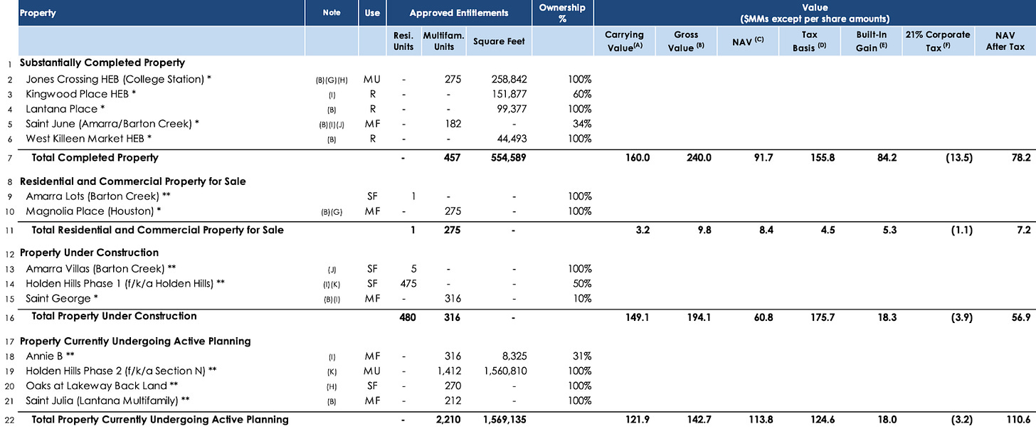 Stratus is a residential and retail-focused real estate company in Austin, Texas. Gross asset value is $693 million. Net asset value is $358 million. Net after tax asset value is $331 million. Market Cap is $214 million. Eastdil Secured is working to close the gap.