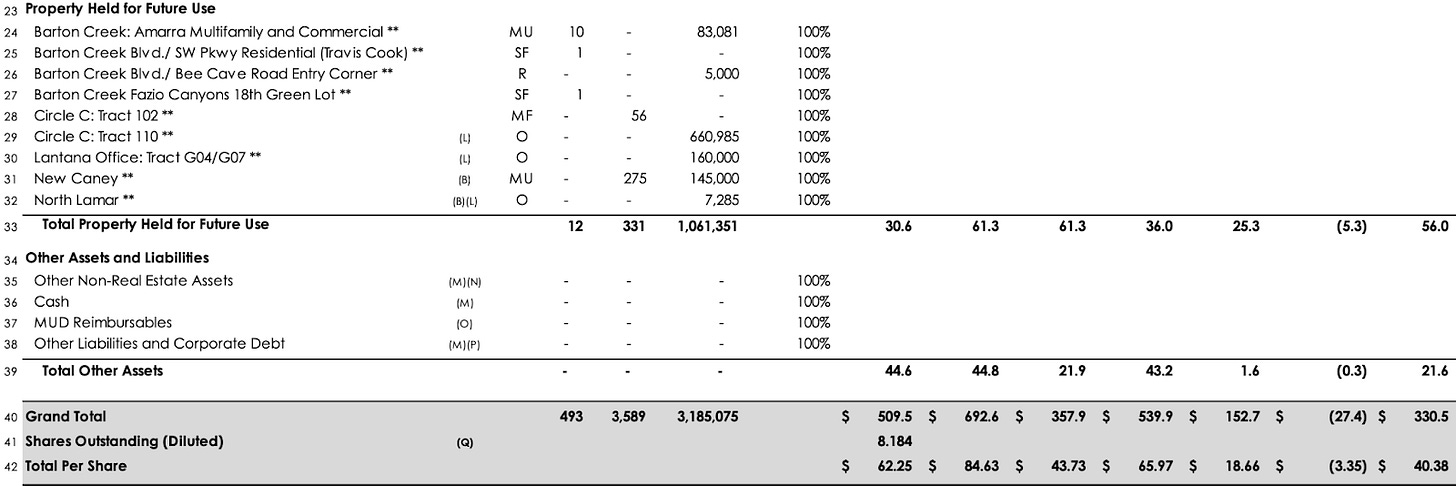 As it happens the market is implying the rest of Stratus – Amarra Villas, Barton Creek, Circle C, Holden Hills and Saint George, comprising one residential unit and 275 residential units for sale, 480 residential and 316 multifamily units under construction, 2,210 multifamily units and 1.57 million square feet of mixed use undergoing active planning, 12 residential and 331 multifamily units, 5,000 square feet of retail, 228,081 square feet of mixed use and 828,270 square feet of office held for future use – is worth $100.4 million ($12.27 per share). Stratus pegs all of this at $244.3 million ($29.85 per share) and, fortunately, has Eastdil Secured to shop the assets to the largest institutions in the world.